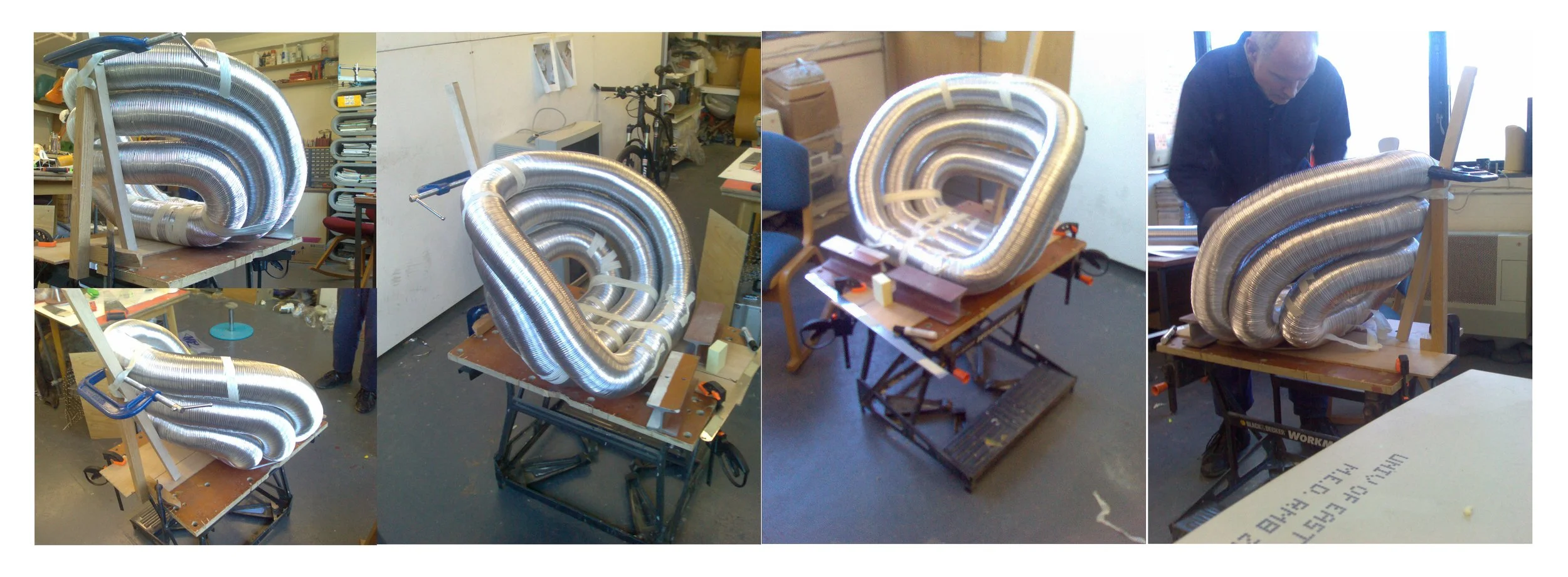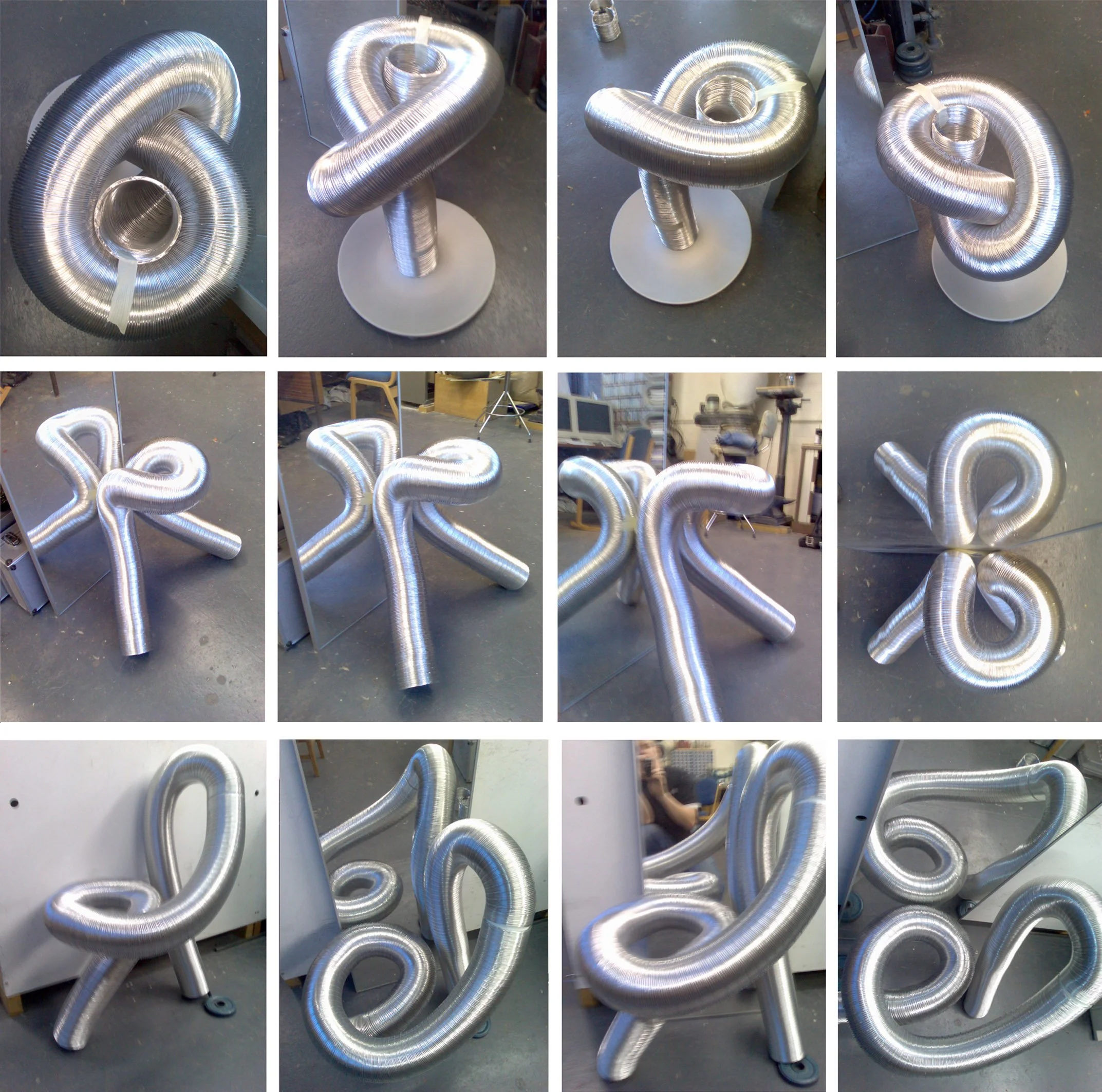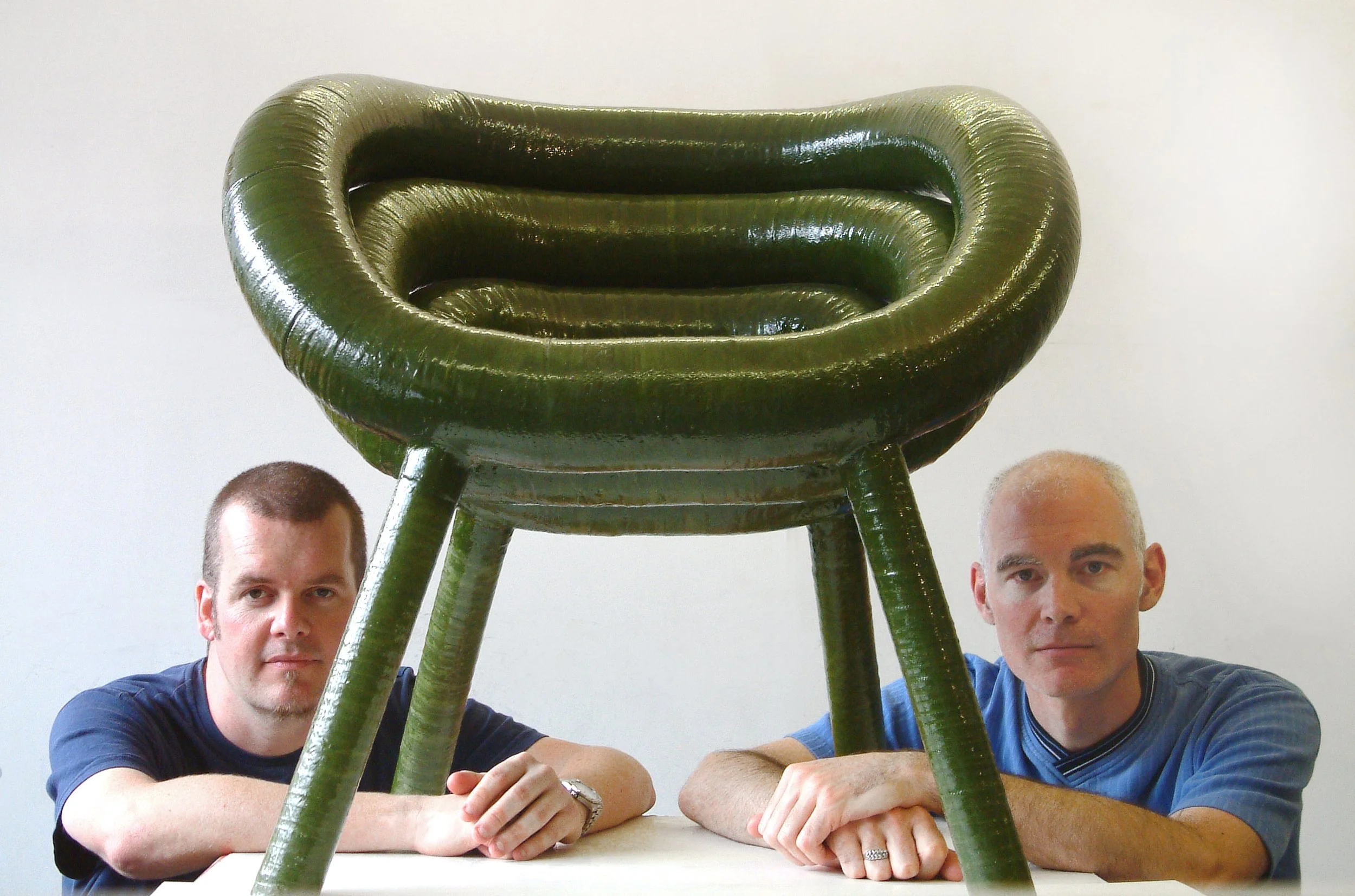 The chair has a deliberate contradiction in that it appears soft, wet and heavy yet its lightweight with a hard surface. It visually references a range of sources from military life jackets through to industrial ducting and even reptilian forms (Godzilla!).